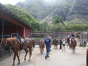 大自然の中で乗馬や射撃、ハイキングなど多彩なアクティビティが楽しめるオアフ島北東部にある「クアロア・ランチ」が開園25周年を迎え、6月16日(水)に関係者を招いた記念イベントを行いました。 約500万坪の広さを誇るクアロア・ランチは元来カメハメハ3世の所有地で、サトウキビ栽培や牧畜の歴史でも知られていますが、1970年代から、乗馬をはじめとする様々なアウトドア・アクティビティを提供するアクティビティ・センターとしてよく知られるようになりました。また、「ジュラシック・パーク」や「ゴジラ」、「パールハーバー」など、数々のハリウッド映画が撮影された場所としても有名で、最近ではTV人気番組「LOST(ロスト)」の撮影が行われました。 イベントに招待された関係者は一般客と共に、乗馬、バス・ツアー、四輪バギーなどを楽しみ、その後25周年を祝うレセプションに参加しました。2007年のナ・ホク・オ・ハワイ・ミュージック・フェスティバル(当時はナ・ホク・ハノハノ・アワード)でコンテンポラリー・アルバム・オブ・ザ・イヤーを受賞したマノアDNAのライブ演奏やクアロア・ランチ社長、ジョン・モーガン氏による開園25周年を祝うスピーチの後、フラも披露され、参加した人達は広大な自然を背景にセンターの魅力を満喫しました。 ワイキキからの送迎サービスもあるクアロア・ランチで、ハワイならではの大自然を楽しんでみませんか? |