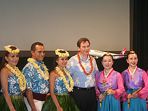 ハワイ州最大の空港会社、ハワイアン航空はハワイ時間6月30日(水)にワイキキのロイヤル・ハワイアン・ホテルで記者会見を実施、同社の韓国ソウルの仁川(インチョン)空港とホノルル間の新路線就航を発表しました。就航の開始は2011年1月の予定です。ハワイアン航空は今年10月に羽田-ホノルル間の路線就航開始も予定しており、韓国からホノルルへの直行便の追加により、アジアからのハワイ渡航者数がさらに増加するものと思われます。