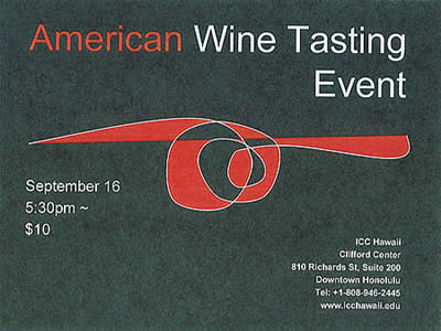 ハワイの語学学校として創立20年の歴史を誇るICCハワイ(インターカルチュラル・コミュニケーション・カレッジ・ハワイ)で2010年9月16日(木)午後5時30分から、アメリカン・ワインの試飲会が開催されます。