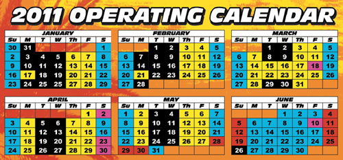 同パークでは、冬の間は毎週月、火、水曜日が休館となっていましたが、2011年3月からは、月曜日もオープン。5月後半までは定休日は火曜日と水曜日のみ(例外あり)となります。詳しくは下記のスケジュール表をごらんください。