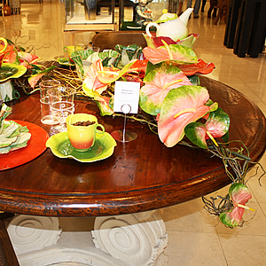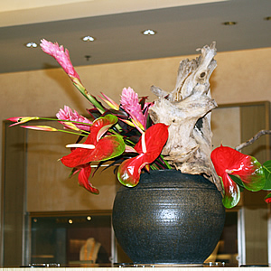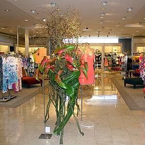 ■ハワイの花を大胆に生けた草月流いけばなの数々! ハワイのいけばな講師、リンダ・ハマサキ先生と、ニーマン・マーカス総支配人夫人のジョイス・トモナリさんなどが中心となり、43人の生徒たちが、今シーズンのカラーやファッションにインスピレーションを得た、美しく大胆な草月流のいけばなを、フロアの各所にディスプレイ。ハワイのお花にこだわり、アンスリウムや胡蝶蘭、デンドロビウム、シンビジウム、ティーリーフなどを、モダンな感覚でアレンジ。小さなものから大きなものまで、素敵なファッションアイテムとハワイのお花の豪華なコラボレーションが目を引く展覧会です。 フロア以外には、入り口付近のウィンドウにも美しいディスプレイが施されていますのでお見逃しなく。 |