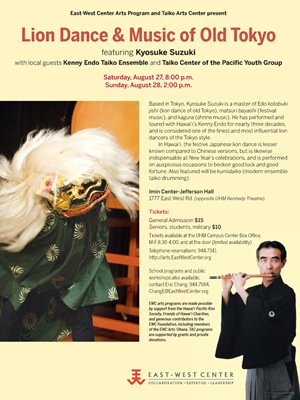 | ●Lion Dance &Old Music of Tokyo 日時:8月27日(土)の午後8時~、28日(日)の午後2時~ 場所:移民センター(ジェファーソン・ホール)、ハワイ大学構内ケネディ劇場向かい チケット:$15 前売り券はハワイ大学キャンパスセンターのボックスオフィスで販売(8:30-16:00、月~金)。当日券もあり。 電話(英語):944-7341