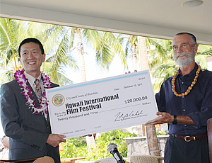 このイベントでは、ハワイを舞台にしたアメリカの人気テレビドラマ、「ハワイ-5-O(ファイブオー)」に出演中の俳優であるアレックス・オローリン、ダニエル・ディ・キム、グレース・パーク、ローレン・ジャーマン、テイラー・ワイリーとプロデューサーのピーター・レンコフをゲストに迎え、パネルディスカッションを行います。質疑応答の部分では、一般の参加者がスターに質問するチャンスもあります。このイベントの参加費は一般は$20でHIFFメンバーは$15となっています。 この映画祭の開幕イベントの記者会見では、ホノルル市長の代理として、ホノルル市マネージング・ディレクターのダグ・チン氏が出席し、文化的な役割を担う国際都市としてのホノルルの発展をサポートするために、2万ドルの寄付金を映画祭のエグゼクティブ・プロデューサーであるチャック・ボーラー氏に手渡しました。
