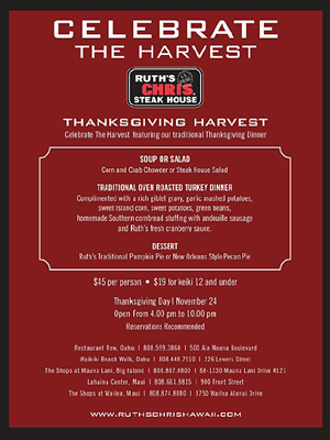 ワイキキ・ビーチ・ウォークをはじめハワイ州内に5支店をかまえるルースズ・クリス・ステーキハウスでは、11月24日(木)の感謝祭に、サンクスギビング(感謝祭)のスペシャル・メニューが用意されます。 アメリカの伝統にのっとった感謝祭のコースディナーは、まずスープ(コーン&クラブ・チャウダー)またはステーキハウス・サラダからスタート。メインは、ターキー(七面鳥)のロースト。リッチなグレービー、ガーリック・マッシュポテト、スイート・アイランド・コーン、スイートポテト、グリーンビーンズ、ホームメードのスタッフィング(コーンブレッド&ソーセージ入り)、そして特製クランベリーソース。デザートは、伝統的なパンプキンパイまたはピーカンパイから選べます。 料金は一人$45で、12才以下の子どもは$19です。混雑が予想されますので、ご予約をおすすめします。 |
