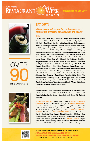 2011年11月14日(月)~20日(日)の1週間、ハワイのテレビ局KGMBの主催で、今年で4回目を迎えるチャリティ・グルメ・イベント、「レストランウィーク」が行われています。人気レストランのスペシャルメニューやコース料理をリーズナブルに楽しめるレストランウィークは、すでに全米の様々な都市で毎年行われ、人気を博しています。ハワイでは今年4回目となりました。参加レストランでは期間中、スペシャルメニューやディスカウント、プロモーションなどが実施され、その収益の一部は、ダイアモンドヘッドにある料理学校「カリナリー・インスティチュート・オブ・ザ・パシフィック」に寄付されるそうです。 人気の名店、アラン・ウォンズやロイズ、ロイヤル・ハワイアン・ホテルのアズーア、モアナ・サーフライダーのビーチハウス・アット・ザ・モアナ、シェラトン・ワイキキのカイ・マーケットやラムファイヤー、アウトリガー・リーフ内のカニ・カ・ピラ・グリル、ロイヤル・ハワイアン・センター内のウルフギャング・ステーキハウスや、ザ・カハラ・ホテル&リゾートのホクズ、ワイキキ・ビーチ・ウォーク内のルースズ・クリス・ステーキハウスやカイワ、タオルミーナ・シシリアン・レストランなども。アラモアナセンターでは、ニーマン・マーカスのマリポサや、メイシーズ内のパイナップル・ルームなどなど盛りだくさん。マウイ島やハワイ島、カウアイ島のレストランでも行われていますよ。 何処に行こうか目移りしそう。参加レストラン一覧は、こちらのページをご覧下さい。 |