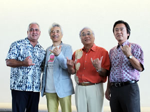 2012年3月25日(日)、ハワイコンベンションセンターで、ハワイシニアライフ協会主催「RAINBOW FOR JAPAN KIDS(レインボー・フォー・ジャパン・キッズ) チャリティ・トーク・ライブ」が行われ多数の人々が参加しました。 このイベントは東日本大震災で被災した中学生に向けた、ハワイ日米協会による教育支援プロジェクト、「RAINBOW FOR JAPAN KIDS(レインボー・フォー・ジャパン・キッズ)」のチャリテの一環として行われたもので、同プロジェクトとパートナーシップを組む宮城県仙台市の一般社団法人「みやぎびっきの会」の代表理事であるミュージシャン&TVパーソナリティーのさとう宗幸(さとう むねゆき)と 、同会理事でミュージシャンの小柴大造(こしばだいぞう)両氏によるパフォーマンスが行われたほか、ハワイ在住ピアニストのCHIYO FLYNNさんによるサロン・ミュージック演奏と、ハワイの人気グループ「マノアDNA」が出演しました。 午後3時からはマスコミ向けの記者会見が行われ、ハワイ州観光局プレジデント兼CEOのマイク・マッカートニー氏、レインボー・フォー・ジャパン・キッズの創設者の一人、日本航空ホノルル支店長の大久保良一氏、みやぎびっきの会代表理事でミュージシャンのさとう宗幸氏、そして今回のチャリティー・トーク・ライブ主催のハワイシニアライフ協会会長の坂井諒三氏が壇上に立ち挨拶しました。 「レインボー・フォー・ジャパン・キッズ」は、今回で3回目を迎えます。今回は被災地から22名の子どもたちが参加しました。さとう氏によると、レインボー・フォー・ジャパン・キッズは3年間で10回の実施を目標にしているそうです。そのためにも、長期的な支援が必要であるとの話に、会場からは大きな拍手が巻き起こりました。 午後4時30分からは、場所をホールに移してチャリティー・トーク・ライブの始まりです。会場の外では、(財)ハワイシニアライフ協会内のボランティア団体ナデシコ・クラブにより、福引チケットや食べ物、飲み物が販売されたほか、寄付金も集められました。チャリティー・トーク・ライブの収益金は、レインボー・フォー・ジャパン・キッズの運営資金に寄付されるそうです。 チヨ・フリンさんによる美しいサロン・ミュージック、マノアDNAの爽やかなハーモニーと続き、小柴大造さんが登場。日英両方の歌で会場をどんどん盛り上げていきます。続いてさとう宗幸さんが登場。大ヒット曲、青葉城恋唄が始まると、会場の日本人ファンから大きな拍手と歓声が巻き起こりました。軽妙かつしみじみと味のあるさとうさんのトーク、榊原光裕さんのピアノに合わせた素晴らしい楽曲の数々に、観客はぐんぐんと引き込まれました。会場にはライブの途中からレインボー・フォー・ジャパン・キッズの子どもたち22名も登場しました。 その後はさとう、小柴両氏のリードで、会場が一体となって「虹をかけよう」を熱唱。最後に、レインボー・フォー・ジャパン・キッズの子どもたちが、自作のウクレレを手に、「上を向いて歩こう」を演奏し、盛り上がりつつチャリティー・トーク・ライブは閉幕しました。 レインボー・フォー・ジャパン・キッズへの寄付や詳細は、こちらのページをご覧ください。 |