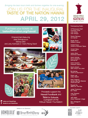 4月29日(日)の午後5時~9時30分、ビショップ博物館で、ハワイで飢えに苦しむ子どもたちを救うため、シェフ・アラン・ウォンを中心に、ハワイの有名シェフ17人が集まって、チャリティ・イベントを開催することになりました。全国的なチャリティ・キャンペーン「テイスト・オブ・ザ・ネーション」の一環で、シェフによるお料理とドリンクのペアリング、サイレント・オークションのほか、イベントの趣旨に賛同したジェイク・シマブクロ、マノアDNA、ジョディ・カミサト&ウクレレ・ライジング・スターによるパフォーマンスも予定されています。 参加シェフは、アラン・ウォン(アラン・ウォンズ・レストラン)、ダレン・デマヤ(カイ・マーケット)、ロジャー・ディコン(ロバーツ・ハワイ)、ヒロシ・フクイ(ヒロシズ・ユーレイジアン・タパス)、ヴィクラム・ガーグ(ハレクラニ)、イサム・ゴトウ(モリモト・ワイキキ)、ケヴィン・へニー(ソルト・キッチン&テイスティング・バー)、コリン・ハザマ(シェラトン・ワイキキ)、スコット・ヒライシ(サム・チョイズ・カイ・ラナイ)、ロビン・リー(ノブ・ワイキキ)、マーク・ノグチ(へエイア・ケア・ピア・ジェネラルストア&デリ)、ラッセル・シュー(3660オン・ザ・ライズ)、ヨハン・スベンソン(BLTステーキ)、アラン・タカサキ(ル・ビストロ)、ジェフ・ヴィジリア(ヒルトン・ハワイアン・ビレッジ)、ロイ・ヤマグチ(ロイズ)ととても豪華。 VIPチケットは、前売りが$150で当日が$175。一般チケットは、前売りが$100で当日が$125です。前売り券はこちらのウェブサイトから購入できます。 |