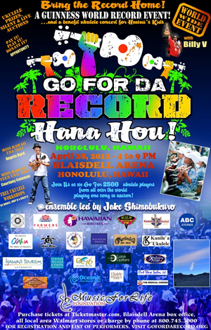 | ◎GO FOR DA RECORD …HANA HOU! 日程:4月28日(土)、15:30-21:00(ギネス挑戦は19:00-) 場所:ニール・ブレイズデル・アリーナ 参加費:ウクレレ持参プレーヤー無料 (レンタルウクレレ$25、ウクレレ・ドネーションプログラム$50)、観覧者 $10 ホームページ(日本語):www.gofordarecord.org/ |