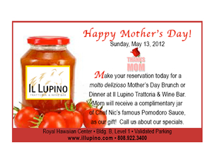 ロイヤル・ハワイアン・センターにあるイタリアンレストラン「イル・ルピーノ・トラットリア&ワインバー(Il Lupino Trattoria & Wine Bar)」。オープンエアのダイニングやバー、オープンキッチンもあるおしゃれな雰囲気と本格的な味で人気です。 同レストランでは5月13日(日)の母の日にマザーズデイ・ブランチ&ディナーを用意。ブランチは、3品(ドリンク、マカデミアナッツとサワークリームのパンケーキ、エッグ・フロレンティーヌ)で$23。ディナーは、3品(スープからサラダ、メインディッシュ、デザート)で$50です。 さらに、当日ママには、シェフ特製のポモドーロソースが特別にプレゼントされます! 気軽にお出かけしてみてくださいね。 |