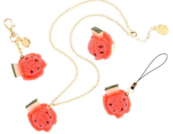 キュートなアクセサリーがいつもいっぱい揃っているアクセサリーブランド「「Q-pot.」では、7月4日(水)からスイカをモチーフにした「スイカシャーベット」コレクションがお目見えします。スイカの種部分にはスワロフスキーがあしらわれ、動くたびにキラキラと輝く、ネックレスやストラップなど。 これは今年の5月から始まった「Summer Festival 2012」シリーズの一環で、かき氷、水飴、そして今回のスイカシリーズでフィナーレを迎えます。夏らしさ満点でキュートなアクセサリーで元気いっぱい夏のおしゃれを楽しんでください。 |