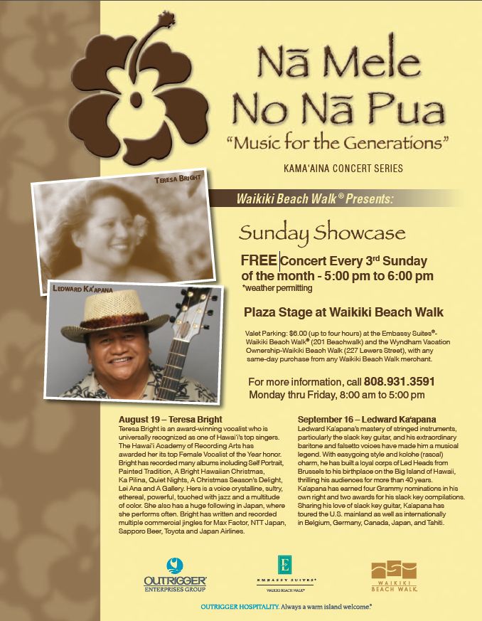 おしゃれなブティックやレストランが立ち並ぶワイキキ・ビーチ・ウォークでは、週末などにさまざまなイベントが企画されていますが、毎月第3日曜日午後5時からは人気ミュージシャンによる無料のコンサートが行われています。 先日、8月、9月に演奏するミュージシャンが発表されました。8月19日(日)は、ハワイのトップボーカリストで、澄きとおるような高音が美しいテレッサ・ブライト。トヨタ、サッポロビール、NTTジャパンなど日本のCMソングでもおなじみのシンガーです。9月16日(日)は、ハワイ独特のギター奏法であるスラック・キー・ギターのトッププレーヤー、レッドワード・カアパナが登場。 ハワイの音楽シーンを牽引するトップミュージシャンが、ワイキキの夕暮れ時を美しく彩ります。お買い物やハワイ散歩のひとときをぜひお楽しみください。 |