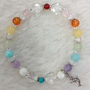 ハワイ発の天然石ブランド「マルラニ・ハワイ」のインターナショナル・マーケット・プレイス店では、毎月スタッフがテーマを決めたオリジナル限定商品が販売されています。8月の限定商品のテーマは、ハワイならではのカラフルなカキ氷、「シェイブアイス」です。 プランテーション時代に日本人移民がハワイに持ち込んだかき氷は、シェイブアイスと名前を変えて、ハワイの人々に愛され続けています。シェイブアイスの中でも一番の人気は、レインボー。そのレインボー・シェイブアイスをテーマにした8月限定ブレスレットは、マザーオブパール(願望実現)、サーペンティン(危険から身を守る)、アラゴナイト(困難を乗り切る)、アメジスト(愛の守護石)、アマゾナイト(決断力)、ローズクォーツ(恋愛成就)、カーネリアン(行動力)、ターコイズ(身代わり石)、メノウ赤(健康)、水晶(他の石をパワーアップ)と、全部で10種類の石を使用したカラフルで豪華なブレスレット。ドルフィンのチャームも付いています。 お値段は$39。おみやげにしても喜ばれそうですね。 |