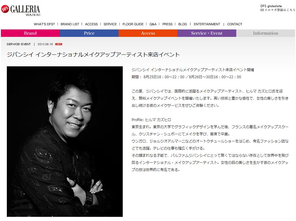 ジバンシイでは、国際的に活躍するメイクアップアーティスト、ヒルマ カズヒロ氏を迎え、無料のメイクアップイベントを開催します。ヒルマ氏は東京生まれで、フランスの有名メイクアップスクール「クリスチャン・シュボー」を主席で卒業し、その後ウンガロ、ジョルジオアルマーニなどのオートクチュールショーなどでも活躍するインターナショナルなメイクアップアーティストです。 またエスティローダーでは、DFSギャラリア・ワイキキの公式ホームページに掲載されているページを提示するかプリントして持参すると、エスティローダーのDFS限定コンパクトミラーがもらえます。