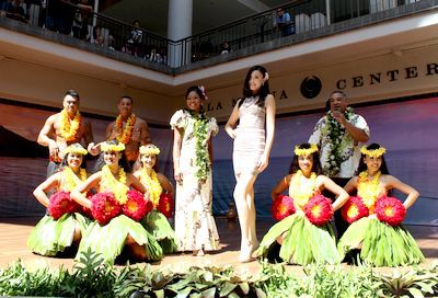 ハワイの一大ショッピングセンターであるアラモアナセンターでは、毎日午後1時からセンターステージで無料のフラショーが開催されていますが、10月12日(金)のショーの中で、現在ハワイを訪れているミスユニバースチャイナが登場しました。 2012ミスユニバースに選ばれたダイアナ・シューさんが、約20分ほどのフラのステージ終了後に登場。すらっと伸びた長い手足と白い肌がひときわ輝き、集まったメディアや観客が次々にカメラのシャッターを切り、そのたびにあちこちに笑顔で応じていました。