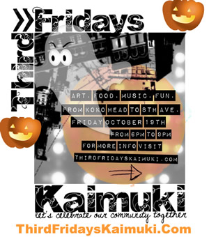 グルメの街として、地元の人々からも観光客からも人気の街、カイムキでは、毎月第3金曜日に街を上げての楽しいイベント「サード・フライデー・カイムキ」が行われていますが、10月のテーマはハロウィン。 10月19日(金)午後6時~9時、カイムキのワイアラエ・アベニュー(ココヘッド・アベニューから8thアベニュー)付近で、様々な屋台やアート、エンターテイメントが楽しめますよ。もちろん参加費は無料。家族揃って楽しめるイベントです。美味しいレストランがいっぱいのカイムキの街を楽しんでみませんか? 詳細はこちらのウェブサイトをご覧ください。 |