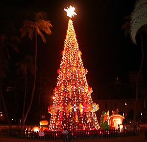 見逃せないのが12月1日(土)に行われるクリスマス・ツリーの点灯式。当日は午後4時より、会場のシビック・センター・グラウンドには食べ物やTシャツ、クリスマス・オーナメントなどを販売するブースが設けられ、何万人もの人々が集まります。5時~は、道を挟んだハワイ最古の教会、カワイアハオ・チャーチでクリスマス・コンサートが行われ、午後6時、ホノルル・ハレの前で式典がはじまり、午後6時30分にピーター・カーライル市長の合図で、ホノルル・ハレ(市役所)前に立てられた大きなツリーが点灯されます。人気エンターテイナーが多数出演するホリデー・コンサートとともに、エレクトリカル・パレードも行われ遅くまでにぎわいます。