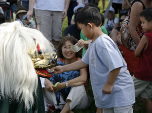 このニュースの写真のように、ハワイでは日本風、中国風、沖縄風を問わず、獅子舞を見たら、1ドル札を食べさせます。お札をもってると、獅子が来て、パクッと手を食べてくれるので、子どもたちは大喜びです。日本では、獅子が頭を噛んでくれましたよね。