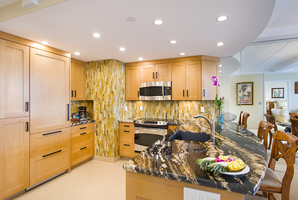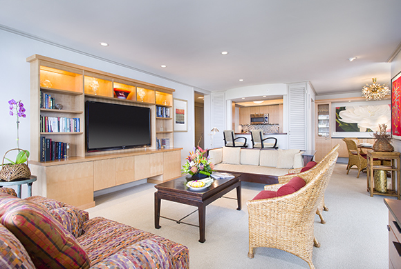 プレミアム・スイートには、ステューディオ、1ベッドルーム、2ベッドルームの3タイプがあり、それぞれのお部屋には、コンテンポラリーな家具やインテリア装飾、高級カウンタートップを使用したデザイナーキッチン、最先端家電が配され、広々としたラナイからは素晴らしいビューが望めます。快適なリビングスペースで、ゆっくりとリゾート気分を満喫できますよ。