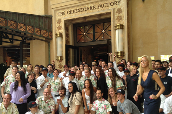 午前11時の開店に先駆けてハワイ式のブレッシング(お清め式)が行われ、従業員がずらりと並ぶ中、カフ(ハワイアンの司祭)が、ティーリーフと聖水でお清めしました。人気のチーズケーキはもちろんのこと、パスタやサラダなどの美味しいメニューはどれを頼んでもはずれなし。ワイキキでの人気店再開に、ファンは大喜びではないでしょうか?