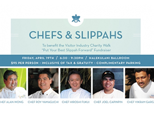 4月19日(金)の午後6時30分~9時30分、オーシャンフロントの最高級ホテル「ハレクラニ」に、5人の人気シェフが集結、「シェフズ&スリッパーズ」と名付けられたグルメなチャリティ・イベントが行われます。 参加シェフは、アラン・ウォン、ロイ・ヤマグチ、ヒロシ・フクイ、ジョエル・カピンピン、ヴィクラム・ガーグの各氏。カクテルと共に、これらのシェフの美味しいお料理が楽しめますよ。参加費は1人$95で、収益金は「インダストリー・チャリティー・ウォーク」への基金として寄付されます。 詳細はこちらのページをご覧ください。 |