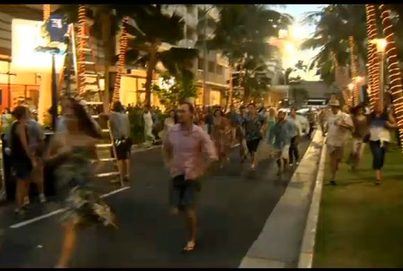 日本で生まれた怪獣映画「Godzilla(ゴジラ)」のハリウッド版の撮影がハワイで始まっていますが、昨日から今朝にかけてワイキキ・ビーチ・ウォークで撮影が行われました。 ちなみにゴジラはコンピューター・グラフィックスで合成されるため、ワイキキ・ビーチ・ウォークには登場していません。 (Star Advertiserより) |