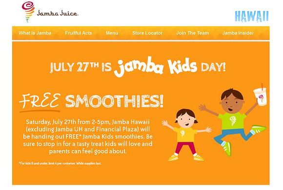 フレッシュなスムージーが人気の「ジャンバジュース」から、子どもたちに無料でキッズスムージーがプレゼントされます。7月27日(土)午後2時から5時までの間は「ジャンバ・フリー・キッズ・スムージー・デイ」と題して、8才以下の子どもに好きなキッズスムージーがもらえます。