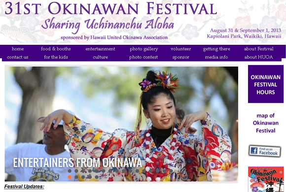 ●第31回オキナワン・フェスティバル 場所:カピオラニ公園バンドスタンド付近 開催日時:2013年8月31日(土)、9月1日(日)の午前9時~午後5時。盆ダンスは31日の午後5時30分~9時30分。 |