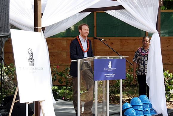 ワイキキのクヒオ通り沿いに建設予定のラグジュアリーなコンド、ザ・リッツ・カールトン・レジデンス ワイキキ・ビーチが、本日8月29日(木)の午前10時より、起工式を行いました。現在は更地状態の竣工予定地にテントを張り行われた起工式ではまず、パックレップLLCの代表、ジェイソン・グロスフェルド氏が挨拶。来賓を紹介すると共に、「様々な困難を強固なチームワークで乗り越え、この日を迎えられたことを嬉しく思います」と挨拶しました。続いて、来賓代表として、ホノルル市長のカーク・コールドウェル氏が壇上に立ち、ザ・リッツ・カールトン・レジデンス ワイキキ・ビーチがワイキキに更なる発展と活気をもたらすことを楽しみにしている、と語りました。続いて、カフ(司祭)によりブレッシング(お清め)が行われ、グロスフェルド氏と来賓たちが、鍬入れの儀式を行いました。