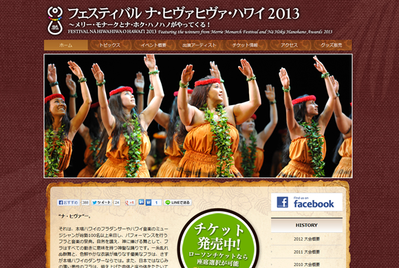 日本在住のフラ関係者やハワイアン音楽ファンに人気の高いイベント、フェスティバル・ナ・ヒヴァヒヴァ・ハワイ2013が、9月14日(土)~16日(月)に、東京ドームシティホールで行われます。 メリー・モナークのミス・アロハ・フラやトップのハーラウ、有名ミュージシャンが繰り広げるステージは必見です。 |