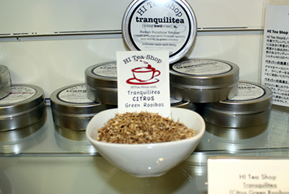 ホノルル・グルメ・フーズは、ハワイ産の厳選された新鮮な材料を使ったサラダドレッシングや天然調味料などの商品を扱っており、KCC・ファーマーズ・マーケットではすでに人気でリピーターも多いお店。店内には、お店のオリジナル食品の他にも、ファーマーズ・マーケットに出店しているハワイ産のトップ・ブランド商品も取り扱っています。その中には、マドレ・チョコレート、カフク・ファームズ、ワイアヌヴァレー・タロ・ロイなど、ハワイのサスティナビリティ(持続可能性)にこだわった商品がずらりとラインナップされています。(写真上は無カフェインのシトラス・ルイボス・ティ)。