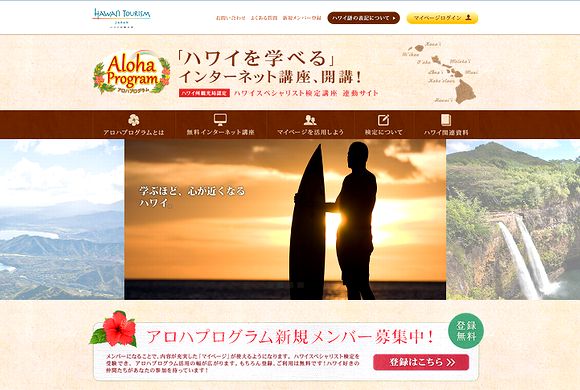 ハワイ州観光局がハワイの文化や歴史、自然などについてもっと知ってもらおうと「アロハプログラム」のウェブサイトをリニューアルしました。同サイトでは、基礎編から文化、歴史などカテゴリ別に紹介し、「ハワイスペシャリスト検定」も初級は無料で受けることができます。 現在は旅行会社などの関係者を対象としていますが、一般の方でもサイトを閲覧することは可能ですし、冬には一般の方も対象としたサイトに拡大していく予定だそうです。
