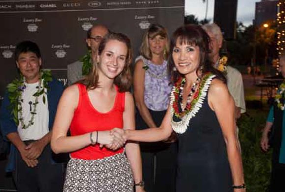 ワイキキにある有名一流ブランドが軒を連ねるショッピングエリア、「ラグジュアリー・ロウ・アット・2100カラカウア・アベニュー」では現在、地元ハワイの芸術家の作品を展示するアートの祭典「ハワイのモダンマスターズ」が行われています。11月7日(木)に行われたオープニングイベントでは、ラグジュアリー・ロウがホノルル・ミュージアム・オブ・アートの非営利団体「アート・トゥ・ゴー」プログラムに寄付金を贈呈しました。「アート・トゥー・ゴー」は、手を差し伸べる必要のあるハワイの子どもたちに美術を指導したり、美術の道具を提供するプログラムで、2003年以来州内で7680人余の子どもたちが参加しています。 |