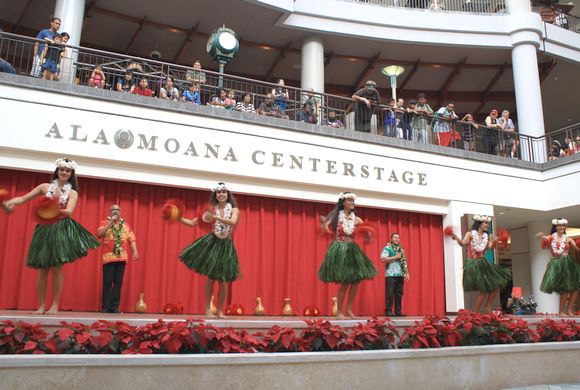 センターステージでは毎日午後1時からフラショーが行われており、本場のフラと生のエンターテイメントショーをショッピングの合間に無料で観覧できます。また今ならショーの最後には、クリスマスバージョンの音楽と共に、スノーが降ってくる演出もあり、こちらも集まった人々を楽しませてくれます。