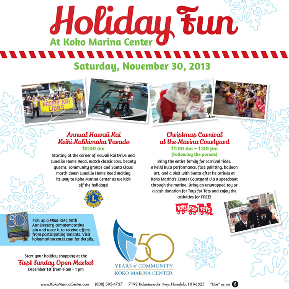 オアフ島東部の高級住宅地、ハワイカイにあるおしゃれなショッピングモール「ココマリーナセンター」で11月30日(土)、楽しいホリデー・イベントが行われます。 まずは午前10時から、恒例の「ケイキ・カリキマカ・パレード」が行われます。ハワイカイ・ドライブとルナリロ・ホームロードの角からスタート、クラシックカーやビューティー・クイーンたち、地元のグループやサンタクロースが、ルナリロ・ホームロードをココマリーナセンターに向かって行進しますよ。 パレードの後、午前11時~午後1時までは、マリーナコートヤードで、クリスマスカーニバルが行われます。遊園地の乗り物や子どものフラ・パフォーマンス、フェイス・ペインティングに風船アートなど家族で楽しめる催しがもりだくさん。サンタさんもボートに乗って駆けつけます。また、恵まれない子どもたちのためにプレゼントを寄付する「トイズ・フォー・トッツ」と名付けれたチャリティ活動も行われます。包まれていない玩具またはお金を寄付してみませんか? 明るくて爽やかな雰囲気のハワイカイは、訪ねるだけでも楽しいところ。ハワイのファミリーと一緒に、一足早いクリスマス気分を味わってみるのもいいですね! |