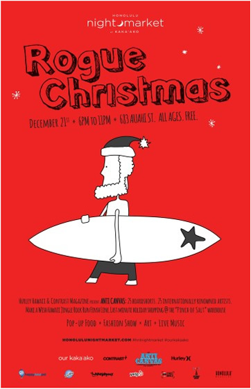 おしゃれなお店が増え進化し続けるエリア、カカアコ地区のアウアヒ通りで、月に一度催されている人気の「ホノルル・ナイト・マーケット」。このイベント、クリスマス前の今週末12月21日(土)にも、「Rogue Christmas(お茶目なクリスマス)」と題して開催されます。イベント広場には、ロコに人気の食べ物、ファッション、アートなどのブースが合計40軒以上参加し、人気DJをゲストに音楽やコンサートで盛り上がります。 今回のスポットライトは、サーフ・ブランドのHurley(ハーレー)とContrast Magazine(コントラスト・マガジン)による、「The Anti-Canvas Art Show(アンチ・キャンバス・アート・ショー)」。クラーク・リトルなど25名の地元ハワイと世界の有名なアーティストたちが、Hurleyのボード・ショーツをキャンバスに描いたものを販売するという画期的なこのショー、実はチャリティーが目的で、その収益金はフィリピンの台風被害者やハワイ・フード・バンクに寄付されるそうです。 カカアコまでワイキキからだと市バス19番や20番が便利ですよ。ハワイのロコたちに大人気の夜間マーケット、覗いてみるのも面白そうですね。