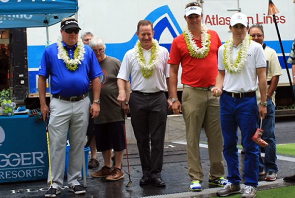 イベント会場では、4名の米国の名ゴルファーたち(左から、カール・ペターソン、ジェフ・マガート、ジェフ・オーバートン、スコット・ラングレー)が、アウトリガー・ホテルの従業員のチームとミニ・ゴルフを競いました。