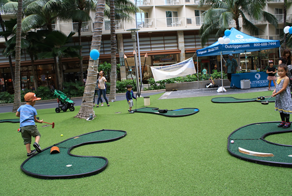 また、ワイキキビーチウォークの芝生エリアに設置されたミニ・パットゴルフ場は、午前11時~午後1時の間一般人も参加できるようになっており、ちびっ子たちがゴルフを楽しむ姿も見られました。さて今年のソニーオープン、どうなるか楽しみですね。 |