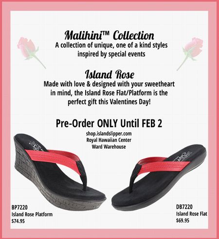 ハワイの老舗サンダル専門店「アイランド・スリッパー」から、バレンタインコレクション「アイランド・ローズ」が登場しました。ヒールがないフラットタイプのサンダル($69.95)と、安定感のあるプラットフォーム($74.95)の2種類で、上品なローズカラーの鼻緒部分がポイントです。 アメリカではバレンタインといえば男性から女性にバラの花束やギフトを贈るのが慣わしのため、こんな女性向けのコレクションが登場していますが、日本の女性ならぜひこの限定サンダルを買い物して楽しんでくださいね。残念ながら事前予約のみの受付で、申し込みは店頭またはオンラインから2月2日まで。 アイランド・スリッパーはワードセンターズとロイヤル・ハワイアン・センターにあります。 ■関連情報/アイランド・スリッパーがロイヤル・ハワイアン・センターに2号店をオープン! |