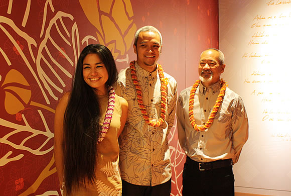 32年前にこの地にオープンしたルイ・ヴィトンですが、常に進化を続け、その時代のトレンドを発信し続けてきました。今回の改装では、ハワイの著名なテキスタイル・デザイナー、シグ・ゼーン氏のチーム(写真下)が、店内エレベーター・ホール周りのアートワークを担当し話題を呼んでいます。シグ・ゼーン氏が得意とするハワイの自然を織り込んだデザインは、オアフ島の花であるイリマがテーマ。ヨーロッパのエスプリとハワイの自然が魅惑的な調和を見せ、モダンな中にも独特のあたたかみを醸し出しています。また、”Ka Lanakila Pio”と題された、伝統的なハワイのチャント(詠唱)の詩も壁に記されています。