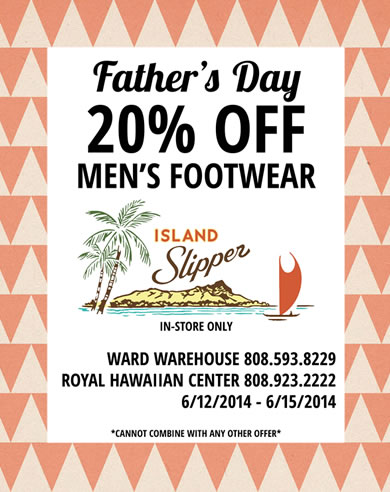 もうすぐ夏、サンダルが恋しい季節になりましたね。ロイヤル・ハワイアン・センターやワード・センターズ内に店舗を構えるハワイの老舗サンダル専門店「アイランド・スリッパー」では、明日6月12日(木)から15日(日)の期間、男性用フットウェアが20%OFFになります。6月15日(日)は父の日。お父さんにおしゃれで履き心地の良いサンダルをプレゼントしてみてはいかが? 20%OFFになるのは、店頭でお買い物した場合のみ。他の割引と併用することはできませんのでご注意ください。 クオリティが高く、しかもデザイン的にも優れたサンダルはプレゼントにも、お土産にも、ハワイ旅行中の履物としてもぴったり。要チェックです。 |