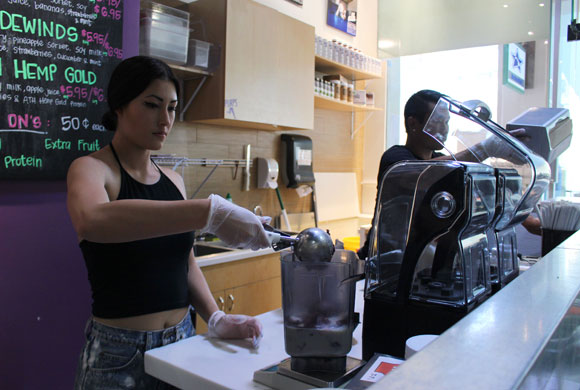 ブルー・ハワイ・サーフのお店に入ったすぐ右側に大きなカウンター・スペースが設けられて、スタッフが手際よくスムージーを作ってくれます。 ■関連記事/ハワイ最大のショッピングセンター/アラモアナセンター