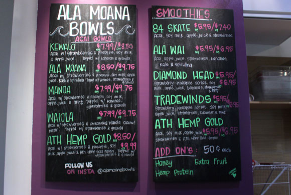 メニューはアサイーボウル5種類とスムージー5種類があって、それぞれハワイにちなんだ名前がつけられています。