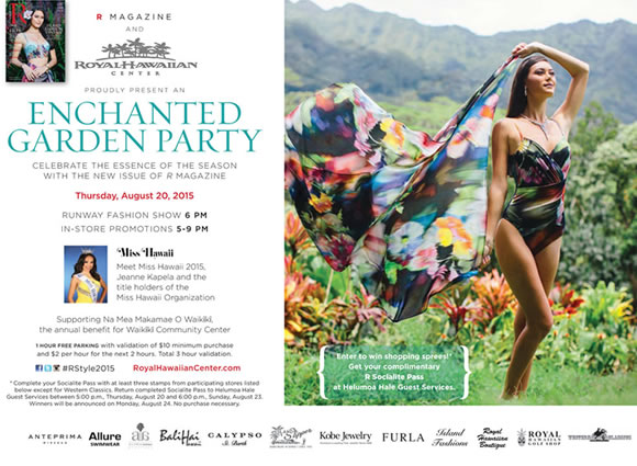 ロイヤル・ハワイアン・センターでは8月20 日(木)午後6時より、秋の恒例ファッションイベント「R Styleファッションイベント」が行われます。ロイヤル・ハワイアン・センターが発行している季刊誌「Rマガジン」の秋号発刊を記念して毎年開催されるこのイベント、今年のテーマは「Enchanted Garden Party:魅惑の庭園パーティ」です。ロイヤル・グローブで6時から行われるファッションショーでは、ミスハワイ2015のジーン・カペラさんやモデルたちが、今秋の注目ファッションを紹介します。