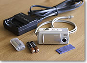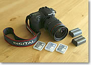 | デジカメではレンズを透ってきた光をCCDとかCMOSと呼ばれる受光素子に受けて画像に変換するのですが、その受光素子がどのくらいの性能(容量)かを表す数値です。一般的に数字が大きければ大きいほど、最終的に大きなプリントにすることができます。撮影するときにはファイルサイズをラージとか、スーパーファインなどのできるだけ大きなサイズを選びます。そうすると1枚のメモリーカードに記録できる枚数が少なくなるので、大容量の予備カードが何枚か必要になる訳です。500万画素クラスのカメラで最高画質モード撮影すると1枚約3MBのファイルになるので、最低でも256MBを1枚、できれば2枚は用意したいですね。デジカメは撮り出すとつい何枚もシャッターを切ってしまって、あっという間に相当な枚数を撮ってしまうことが多いものです。動画撮影機能を持った機種も珍しくないので、ビデオとカメラを両方持つのはやめにして動画もデジカメで撮ってしまう(クオリティは落ちるけれど)という手もあります。ただし、その場合は予備のメモリーカードとバッテリーはさらにタップリと用意しましょう。 |
