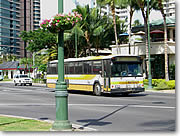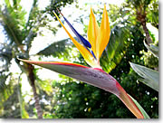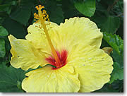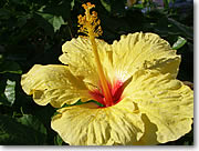 ■ハワイらしいカラフルな草花のマクロショットに挑戦 ハワイではいたるところできれいな花を見かけることができます。たとえばワイキキのカラカウア通りのちょっとした植え込みにも気をつけてみると魅力的な被写体がたくさんあるんです。その中からいちばん大ぶりの黄色いハイビスカスを狙ってみましょう。まずデジカメのスイッチを入れてマクロモードにセットします。「花」のアイコンがマクロモードの表示になっている機種が多いようです。さあこれでハイビスカスにクローズアップ、とその前に自分のデジカメがどのくらい近くまで被写体に接近できるのかチェックしましょう。機種によってはレンズの直前まで近寄れる1センチマクロや0センチマクロなどというすごい機能を搭載しているものもありますが、この連載に使用している機種は携帯性を重視した薄型ボディのせいかマクロモードにしてもズームの望遠側では40センチ程度までしか近寄れません。ズームをワイドにすると20センチ程度まで寄れるのですが、花を撮る場合はなるべく画角を望遠側にした方が背景とメインの被写体である花がはっきり分かれて見えるため、ズームを望遠側にしたときにどこまで近寄れるかで使い勝手が変わってくるので、ちょっと残念です。さて、実際にどこまで近寄れるかのチェックはデジカメのモニターを見ながら左手の腕時計にどこまでピントが合うかでおおよそわかります。カタログデータで何センチ、と覚えるよりこの方がこのくらい近寄ったらピントが合わなくなる、と感覚で覚えられます。腕時計はコントラストがある被写体なのでピントが合わせやすいというメリットもあります。 |