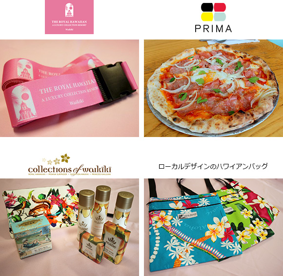 ●ロイヤル・ハワイアン・ラグジュアリー・コレクション・リゾートのロゴ入り・スーツケース・ベルト(非売品):“太平洋のピンク・パレス”として愛されるホテル、ロイヤル・ハワイアンのロゴ入りオリジナルアイテムはコレクターがいるほど人気のものばかり。ホテルのテーマカラーであるピンク色がとてもキュートです。ロイヤル・ハワイアンのウェブサイト(日本語)はこちら、フェイスブック日本語公式ページはこちらにあります。 ●イタリアン・レストラン「プリマ」$50商品券:カイルアにある「Prima(プリマ)」は本場顔負けのピザで有名な店。パリパリに焼かれたピザのほかサンドイッチなども楽しめます。プリマのウェブサイト(英語)はこちら。 ●コレクションズ・オブ・ワイキキの人気セレクトアイテム:シェラトン・ワイキキ、ロイヤル・ハワイアン・ラグジュアリー・コレクション・リゾートなどワイキキにあるスターウッド ハワイ ホテル&リゾートの4つのホテル内ショップ「コレクションズ・ワイキキ」からポーチ、帽子など人気の品を差し上げます(※参加店舗:パシュマ、ホノルル チョコレート カンパニー、サンド・ピープル、マリエ・オーガニクス、グリーン・ルーム、ワイキキ・ビーチボーイ、レベッカ・ビーチ)。コレクションズ・オブ・ワイキキのウェブサイト(日本語)はこちら。 ●ローカルデザインのハワイアンバッグ:ハワイで見つけた、キュートなローカルデザインのショルダーバッグです。