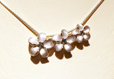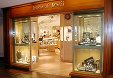 人気のハワイアン・ジュエリー、デニー・ウォンのラインなどをを扱っているお店。全ての商品に品質と品格があります。3つのプルメリアが並んだチャームは向きを変えて使うことができ、過去、現在、未来の幸福という意味が込められています。プルメリア1つのジュエリーはリング、ピアス、ネックレスとそろえることができ、値段は$340から。日本語、日本円とも使用できます。