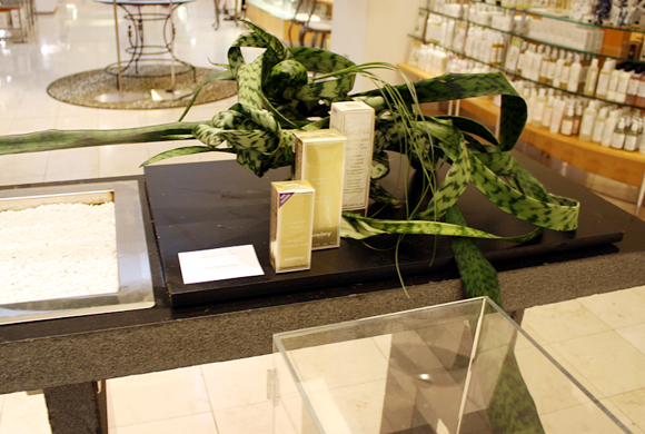 コスメのセクションで見つけた作品。なんと長い葉をグルグルっと巻いて、不思議なオブジェに。シンプルな植物が美術作品にうまれかわりました。モダンで自由なアレンジメントも草月流の魅力なのでしょうね。