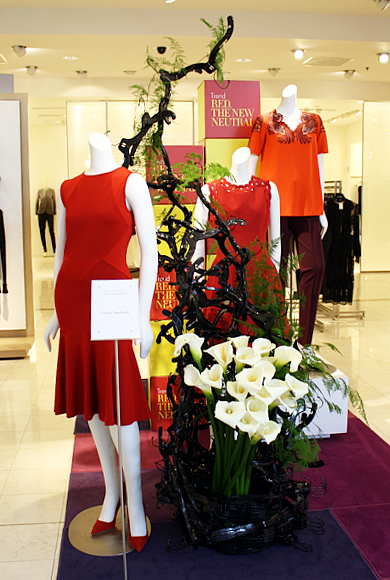 シューズ売場、クリスチャン・ルブタンとのコラボは、真っ赤なアンスリウム。靴のディスプレー台を利用した立体的なオブジェは、ルブタンのシンボルでもある真っ赤な靴底とあいまって、おしゃれでモダンな世界を演出していますね。