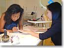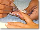 今回お世話になったのは、ネイルアーティストのケイコさん。お洒落でフレンドリーなアーティストさんたちとのお話も楽しみのひとつ。ベーシックなコースは、まず爪の形を整えて甘皮の処理。続いて、肘から下を丹念にマッサージしてくれます。このマッサージが最高に気持ちイイ! 思わず頭がボーッとしてしまう程。ケイコさんによると「どんな人でも、腕を揉まれると静かになっちゃうんですよ」とのこと。「日本でも、人を見るときは靴と時計を見ろとか言いますけど、近頃アメリカではそれに加えて手を見ろって言うんですって」。アメリカでは、手入れの行き届いた爪はステータスのシンボルとみるそうです。ネイルラボの常連客にもローカルのセレブが多いとか。爪って結構目立ちますもんね。日本からはスッチーやモデル、芸能関係の人たちも御用達だそうで、最近では男性の利用客も多いんだそうです。